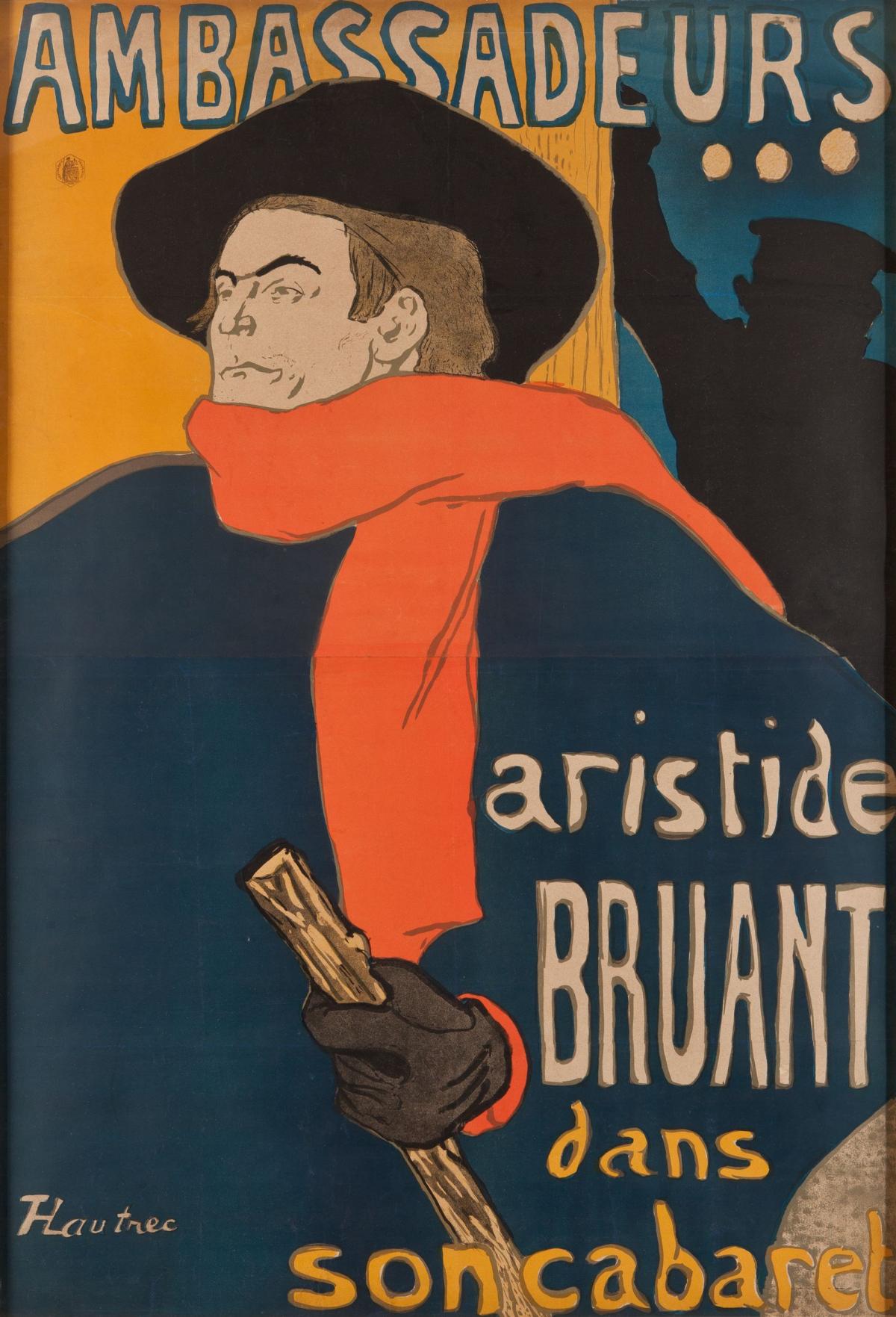 En 1892, le chansonnier et écrivain Aristide Bruant est à l’apogée de sa carrière. Il s’est lié d’amitié avec Henri de Toulouse-Lautrec qui venait voir ses spectacles au Mirliton, cabaret que Bruant a ouvert quelques années plus tôt. Il commande à Lautrec plusieurs affiches de spectacle dont cette dernière. "Ambassadeurs" est un café-concert chic, situé sur les Champs-Elysées. Grand, poitrine large et bombée, l’oeil malicieux et la lèvre ironique, le personnage est traité de manière imposante. Sa silhouette massive occupe l’intégralité du premier plan. Bruant porte de larges vêtements de velours, de lourdes bottes, il revêt un long manteau à pèlerine et un chapeau aux bords immenses lorsqu’il sort. Lautrec représente en quelques traits l’essence même de la personnalité de son modèle et le réduit aux éléments caractéristiques : l’écharpe rouge, le grand chapeau noir et le gourdin qui lui tient lieu de canne. Il campe le chansonnier de trois quarts, jouant tant par la silhouette que par le fond sur lequel il se détache. Le décor est absent, seul le personnage du machiniste dans la pénombre et traité en noir introduit la profondeur. Pour l’anecdote, le directeur des "Ambassadeurs" avait accepté de payer l’affiche mais s'est effarouché lorsqu’il la vit, la trouvant trop audacieuse dans sa composition, trop brutale et vulgaire pour sa clientèle quelque peu snob. Il a fallu, pour qu’il l’accepte, que Bruant le menace de ne pas monter sur scène. Il a exigé qu’elle soit exhibée de chaque côté de la scène et placardée dans toute la ville le soir même de la représentation.