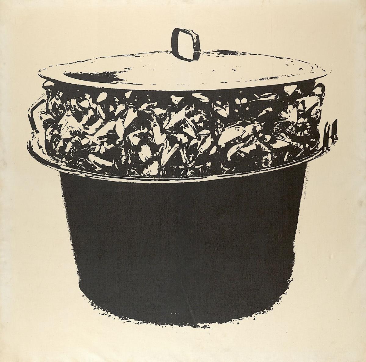 La photographie sur toile sensibilisée de la Casserole de moule qui appartient à nos collections est le reflet de ces objets auxquels la qualité d’œuvre d’art est refusée. Référence triviale à la belgitude et au goût bourgeois de la bonne chère, elle renvoie à ce que l’on considère habituellement, avec un certain mépris, comme de la culture de masse. L’artiste met ainsi volontairement en déroute intellectuels et esthètes. Il existe des similitudes de techniques entre cette toile et les productions du Pop Art américain mais la bichromie banale, la piètre qualité du cliché employé montrent que Broodthaers dénie, contrairement à ses collègues d’outre-Atlantique, toute valeur artistique à l’objet ou à son image.