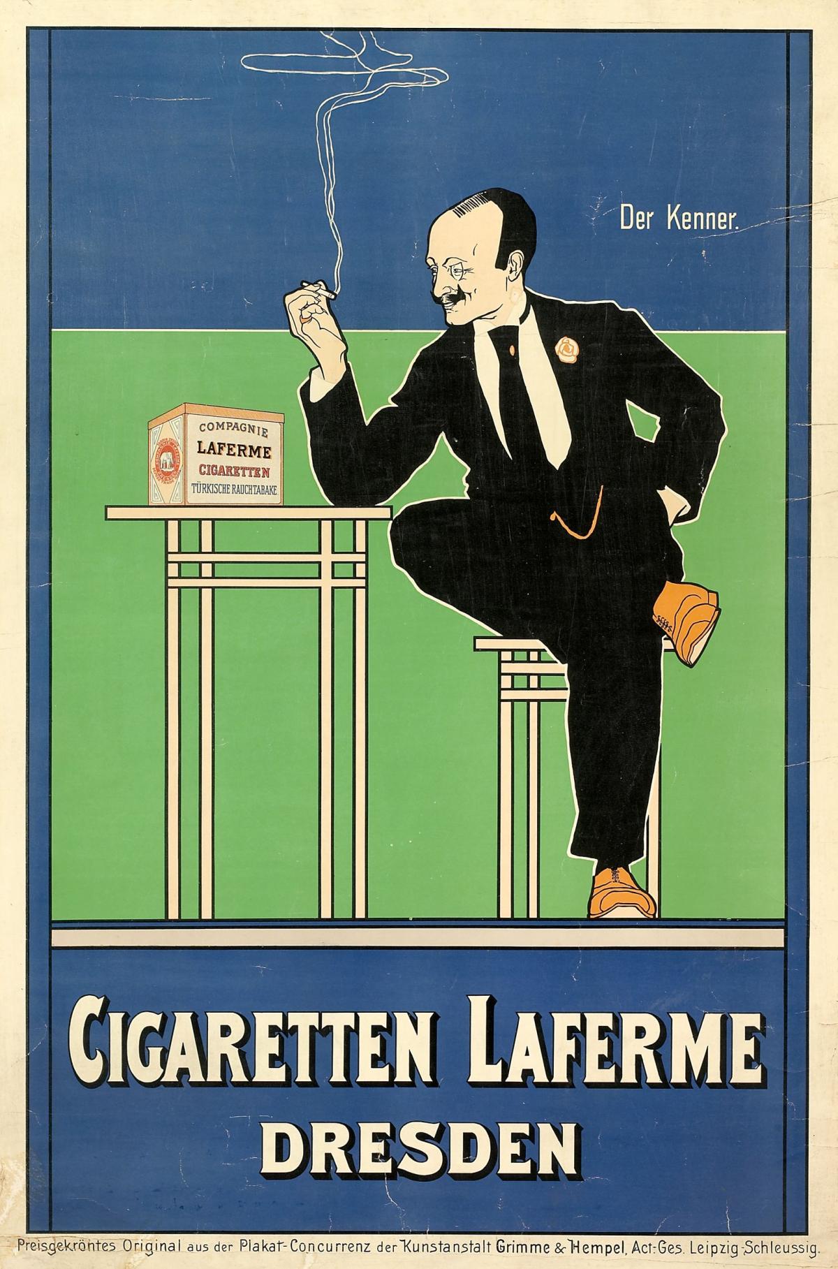 L’affiche Cigaretten Laferme Dresden, réalisée vers 1910 par l’artiste Fritz Rehm, incarne l’élégance moderne et l’efficacité visuelle propres à l’affiche allemande du début du XXe siècle. La composition de l’affiche repose sur des aplats de couleurs franches, une géométrie claire et un dessin épuré aux contours nets. Ce style graphique est typique du Plakatstil, un style d’affiche en réaction à l’esthétique plus ornementée de l’Art Nouveau, qui est en émergence en Allemagne au début du XXe siècle. Simple, l’image présente un homme vêtu d’un élégant costume noir, assis nonchalamment à une table, une cigarette à la main d’où s’élève une volute de fumée stylisée. À côté de lui trône une boîte de cigarettes Laferme. Le personnage, au regard sûr de lui, est désigné par l’inscription « Der Kenner » (« Le connaisseur »), créant l’image d’une marque élégante, accessible à ceux qui savent apprécier les produits de qualité.Le contraste entre le fond géométrique et le personnage expressif suggère une tension entre tradition et modernité, entre raffinement personnel et production industrielle. Laferme, qui était l’une des premières entreprises à exploiter les ressorts de l’image imprimée pour le marketing du tabac, participe activement à la construction d’une identité visuelle de la modernité industrielle allemande, tout en contribuant à faire de la cigarette un objet de distinction sociale. Fondée en 1862 par Joseph Michael von Huppmann-Valbelle à Dresde (Allemagne), la Compagnie Laferme était une filiale créée par l’entreprise russe du même nom pour échapper aux lourdes taxes sur le tabac en Russie. Première fabrique de cigarettes de la ville, elle a contribué de manière importante à son développement industriel. Progressivement, Dresde est devenue un centre majeur de production de cigarettes, au point qu’en 1920, une cigarette sur quatre vendue en Allemagne y était fabriquée.MLF