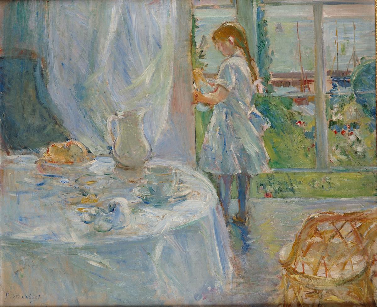 Dans cet Intérieur de cottage (ou Intérieur à Jersey, titre initial du tableau), l’artiste impressionniste Berthe Morisot peint sa fille Julie, 8 ans, dans la maison sur l’île anglo-normande où elles passent l’été 1886. Dans une lettre adressée à Claude Monet, Morisot décrit ainsi son cottage d’adoption : « J’ai un bow window sur la mer et un jardin qui n’est qu’une botte de fleurs. Vous en feriez des merveilles ! ». Morisot et sa fille sont accompagnées d’Eugène Manet, l’époux de Berthe et père de Julie, figuré assis dans le fauteuil bleu à gauche sur le pastel préparatoire. Dans cette composition finale à l’huile, ce siège est vide, poussé vers l’arrière – Eugène semble avoir tout juste quitté la table du déjeuner. Morisot se concentre sur la figure de sa fille, qui s’est aussi levée de sa chaise en osier, pour se tenir près de la baie vitrée, plus intéressée par sa poupée que par la vue sur le port de Gouray. Tout au long de son enfance, qu’elle soit en train d’écrire, de lire, de jouer, etc., Julie a souvent servi de modèle à Berthe Morisot, ainsi qu’aux peintres de son entourage, Edouard Manet (frère d’Eugène) et Pierre-Auguste Renoir. Exposé au Salon des XX à Bruxelles en 1887, ce tableau est représentatif de l’œuvre de Berthe Morisot, centré autour de son environnement domestique et de la vie de famille, à un moment où ses collègues hommes du groupe impressionniste peignent les bars et les grands boulevards. Si leurs sujets diffèrent, la modernité est tout aussi frappante chez Morisot, qui capte de façon très personnelle des instantanés de son univers en peinture. S’il s’agit ici d’une représentation intime, émouvante de sa fille, Berthe Morisot en fait tout autant un manifeste impressionniste, avec son cadrage photographique, ses larges touches dynamiques donnant un effet spontané, esquissé, et son attention portée à l’atmosphère et aux effets changeants de la lumière, inondant la pièce depuis la baie vitrée, ou filtrée à travers les voilages. Le critique Gustave Geffroy commente : « toute la toile est phosphorescente de la grande clarté marine dehors » ; on sent presque souffler la brise. Ce qui frappe également, est la palette à la fois unifiée et nuancée choisie par Morisot, multipliant les blancs et les bleus avec une liberté et une richesse qui font de cet Intérieur une véritable « fête de peinture ».