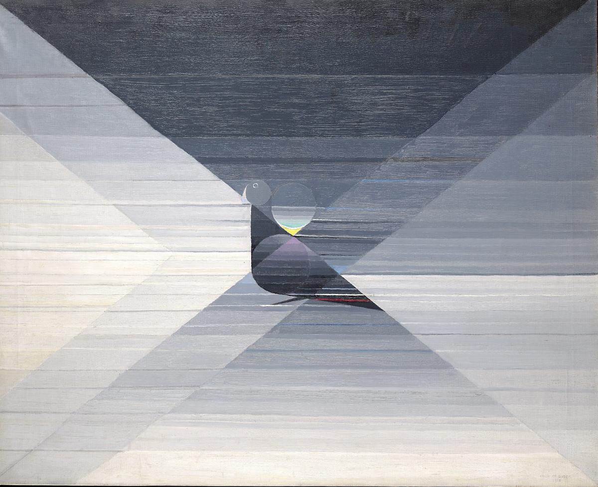 Dans cette peinture, Félix de Boeck combine figuration géométrique et abstraction. Le pigeon se trouve au croisement d’un réseau de diagonales dont le point d’intersection irradie. Des bandes horizontales en camaïeu de gris, dont les effets lumineux sont modulés par le jeu de ces rayons convergents, augmentent encore l’effort de concentration de la composition en un point de clarté. Ce noyau d’énergie est tel un lieu de rencontre de la matière et de l’esprit. Le sujet semble suspendu en un moment de méditation.Le point, la ligne, le triangle et la sphère sont autant de symboles universels qui reviennent fréquemment dans son œuvre, lui conférant une dimension cosmique et spirituelle. L’artiste travaille à la règle et au compas. Parfois de savantes combinaisons de cercles finement gravés dans la matière confinent au système et envahissent la composition; la lecture générale en est alors affectée. De Boeck est également peintre de la lumière; qu’elle soit diffuse ou concentrée, constitutive d’atmosphère ou, dans ses recherches ultérieures, de la phosphorescence des couleurs, elle joue un rôle déterminant.