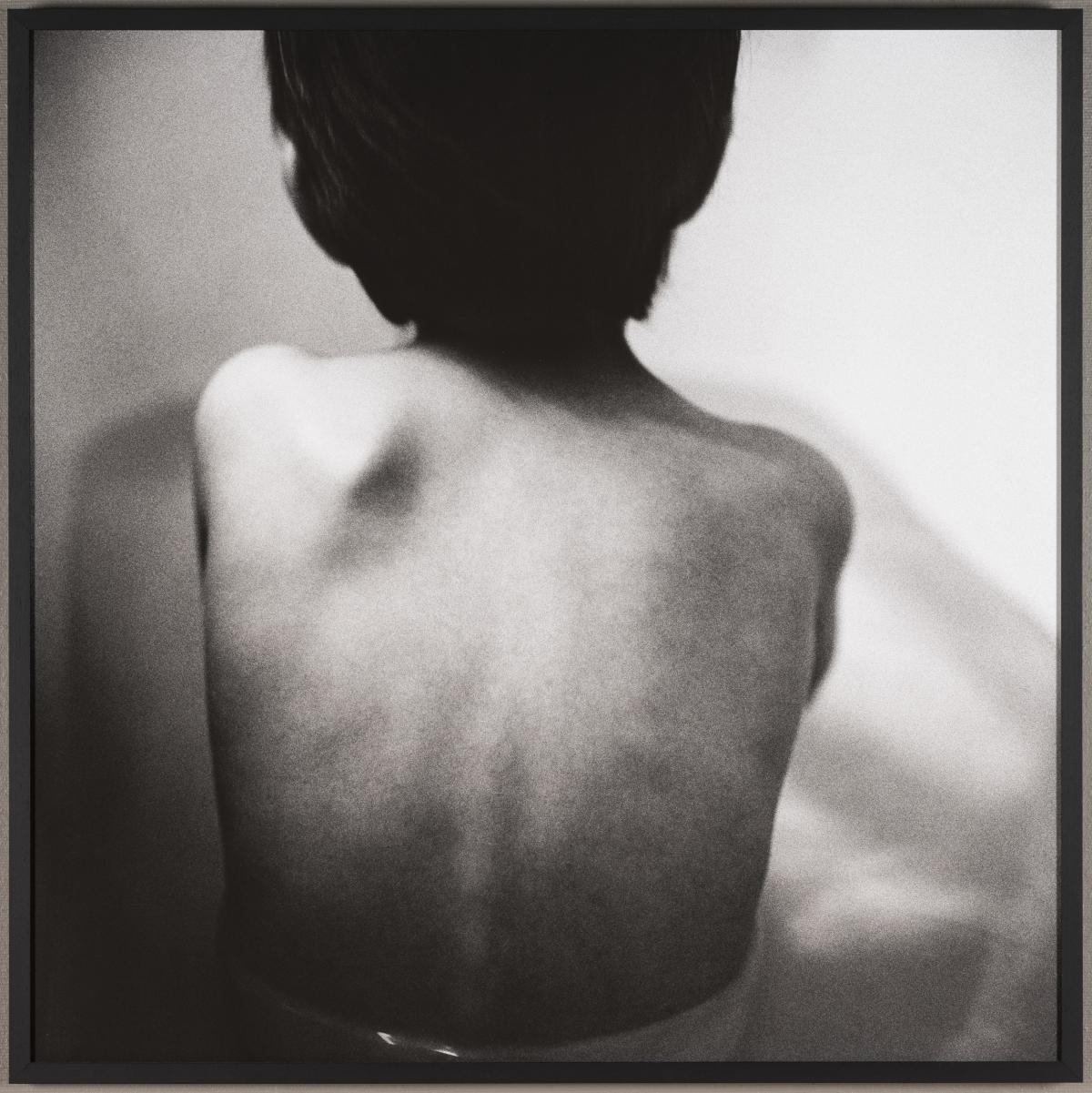 Les photographies Autoportrait, Max, mains billes et Pterodactyl font partie d’une même série, publiée aux éditions Caillou Bleu sous le titre « L’amoureuse ». Anne De Gelas entreprend cette série suite à la mort de son compagnon, le père de son fils. Elle perçoit ce travail comme une démarche thérapeutique nécessaire pour dépasser sa souffrance. Les autoportraits s’imposent rapidement à elle comme une manière de combler l’absence du regard de l’être aimé sur sa propre personne. Comment faire face au vide, au deuil ? De cette épreuve naît également un nouveau face-à-face avec son fils, entre complicité et confrontation. La photographie Max de dos est extraite du livre « Mère et fils », suite de « L’amoureuse ». Dans l’œuvre d’Anne De Gelas, les prises de vue sont intimes et dépouillées. Les cadrages sont serrés, les décors quasi systématiquement éliminés. Ils questionnent la solitude.