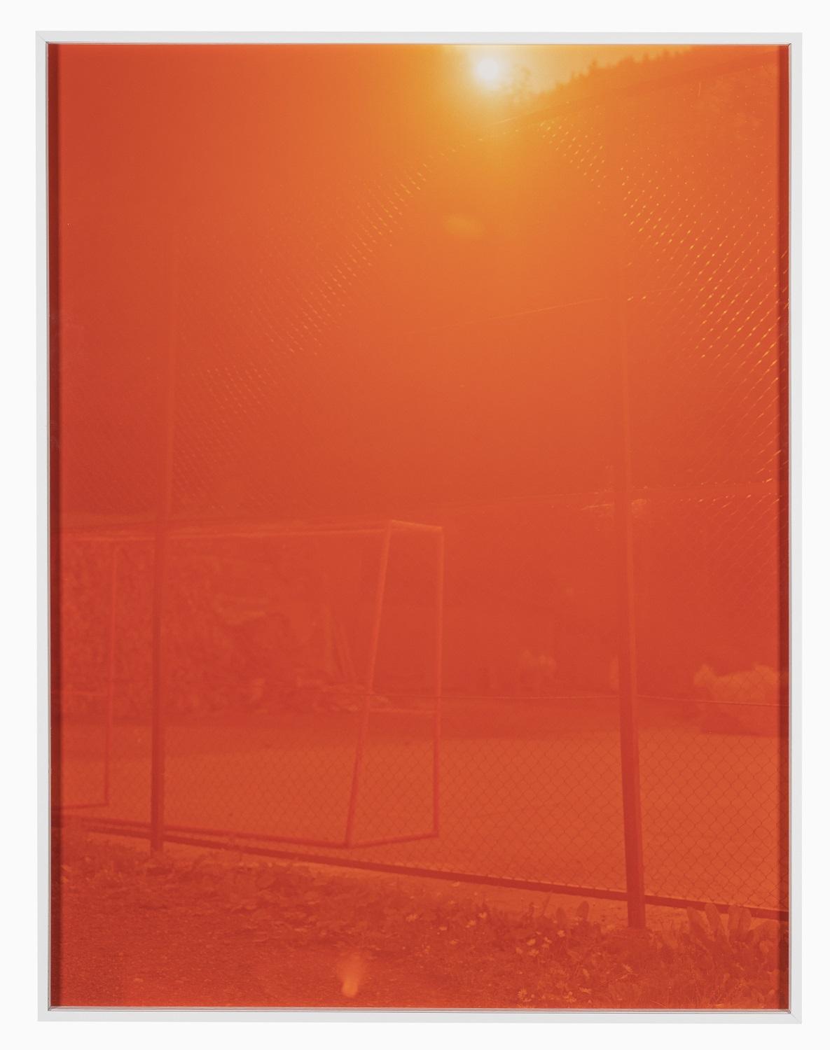 R_4 (orange) fait partie de la série « Mono » qui, bien que rassemblant majoritairement des tirages en noir et blanc, marque le début des expérimentations de Michel Mazzoni sur la couleur. Le titre se réfère très littéralement au contexte de création de l’œuvre : « R » pour Roumanie, où la photographie a été prise, et « 4 » pour la place chronologique qu’elle occupe au sein de la série. Dans cet ensemble, l’artiste explore la notion de monochrome, la densité visuelle et le degré d’abstraction que celle-ci peut induire. Si des motifs semblent perceptibles, la couleur orange et la lumière diffuse plongent l’image dans un climat sur-réel. Mazzoni s’amuse des composantes de l’image ainsi que du processus photographique lui-même. Le cinéma d’Antonioni ou de Marker, tout comme les premiers essais photographiques, font partie de ses sources d’inspiration. L’artiste intervient parfois directement sur les films, comme c’est le cas pour R_4 (orange) dont il a pré-voilé et scanné le négatif. Le concept de fragment est important pour Mazzoni qui considère que ses photographies ont une fonction de traces, témoignages visuels de ses déambulations.