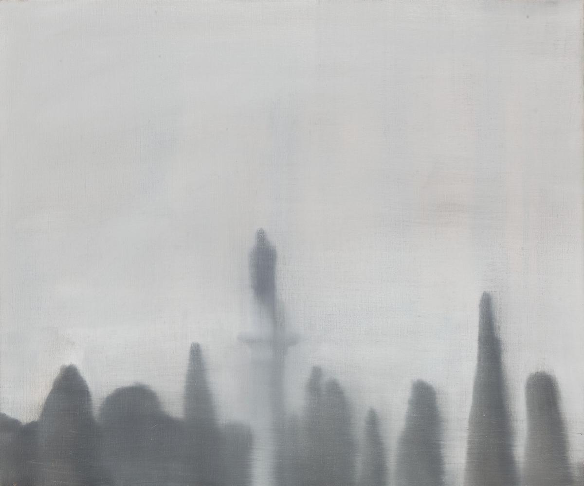 Bert De Beul honore avec sensibilité des sujets simples, quotidiens. Ici, la cime de quelques arbres et un lampadaire se dessinent au loin, dans la partie inférieure de la toile. Leurs silhouettes se dressent côte à côte, dans une atmosphère paradoxalement pondéreuse et délicate à la fois. La palette de gris est subtile. Attaché à un réalisme quasi-photographique (ou plutôt, à la notion de « flou photographique »), l’artiste s’en éloigne néanmoins en plongeant ses vues dans un sfumato éminemment pictural. La plupart de ses œuvres demeure « Sans titre », accentuant cette distance ou cette incertitude face au référent réel. Ses motifs semblent vouloir se calfeutrer dans le champ du « jamais pleinement saisissable ». Avant de se consacrer entièrement à la peinture, Bert De Beul a étudié l’histoire de l’art et a été un temps responsable de la collection du MuHKA (Anvers).
