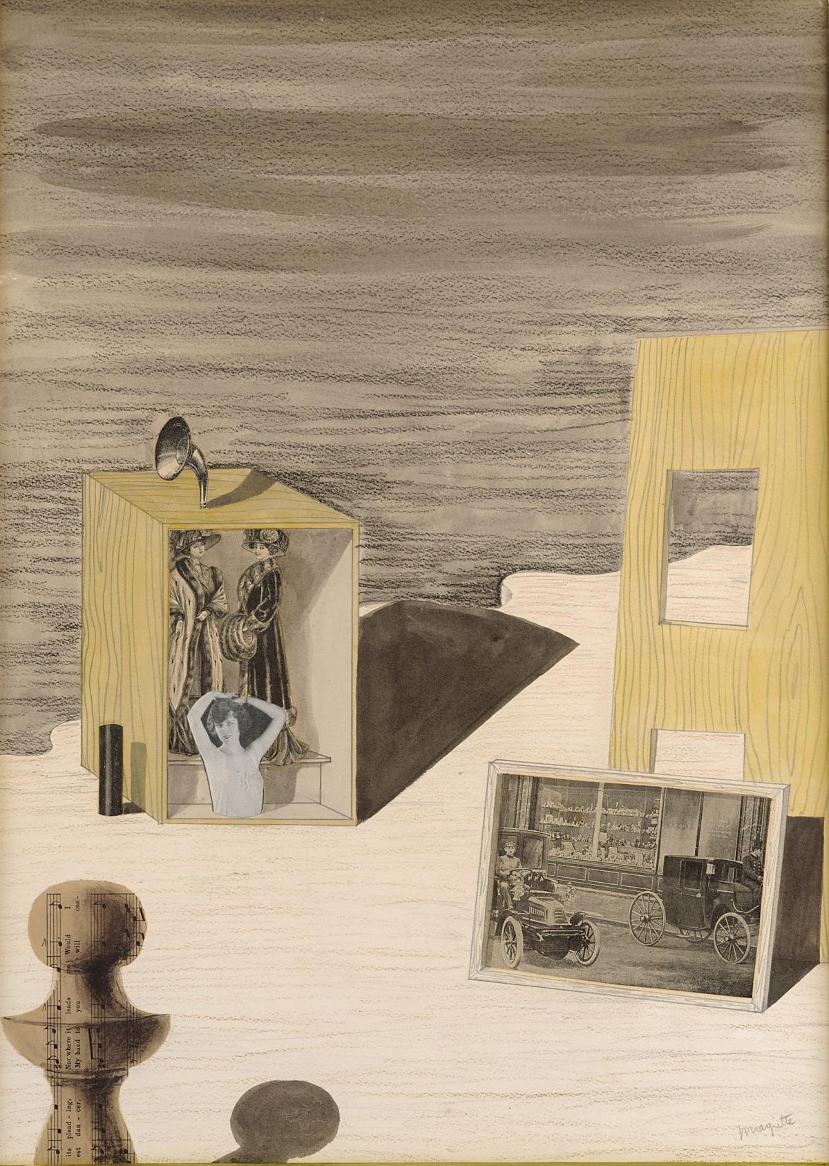 Au début des années 20, l’amitié de René Magritte avec des artistes liés au mouvement dada et la découverte de l’œuvre de Giorgio De Chirico en 1925, l’oriente définitivement vers le surréalisme. Il crée cette année-là ses premiers collages, sans doute influencé par les collages originaux de Max Ernst. L’artiste en réalisera environ 24 jusqu’en 1927, date de son départ pour Paris. On retrouve déjà dans ces premières œuvres les motifs typiques de la grammaire « magrittienne » comme le fameux bilboquet à l’avant-plan. Dans un espace mystérieux, il juxtapose des photos découpées comme celle d’une devanture de magasin et des éléments architecturaux dessinés comme la boîte ou la paroi percée d’ouvertures qui lui permet de suggérer la perspective. La musique semble être un élément récurrent de ce collage, avec les extraits de partition collés sur le bilboquet à l’avant-plan mais aussi par le mystérieux phonographe qui est devenu un cube abritant des jeunes femmes. L’usage de partitions musicales dans ses collages découle d’abord de sa pratique professionnelle (il a illustré des couvertures de partitions) mais est aussi sans doute un hommage à son ami E.L.T Mesens, poète et compositeur. Mais comme toujours chez Magritte, la signification de l’œuvre nous échappe, comme dira le peintre : « Je veille, dans la mesure du possible, à ne faire que des peintures qui suscitent le mystère avec la précision et l’enchantement nécessaire à la vie des idées. »