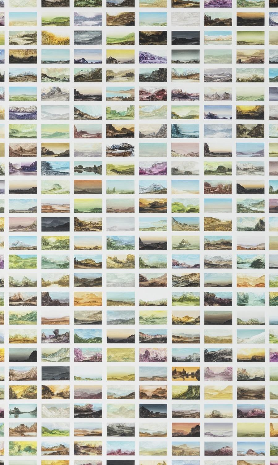 La démarche de Stefan Peters s’inscrit dans une réflexion sur la peinture elle-même, en relation avec la culture digitale de l’image dans laquelle nous sommes baignés. L’oeuvre fait partie de la série « Chronicles », qui décortique le thème du paysage. Sur panneau de bois, l’artiste développe à l’acrylique les infinis potentiels offerts par celui-ci. Au format de cartes postales, les vues sont démultipliées. Elles incarnent toutes des peintures de paysages « possibles », qui auraient chacune pu devenir un tableau indépendant. Ces possibilités ne sont pas clôturées : les décors qui bordent le cadre sont coupés, comme pour signifier qu’ils se prolongent. Peters les catalogue au sein d’une grille, d’une manière quasiment scientifique ou photographique. En Occident, la tradition de la peinture de paysage prend ancrage au moment où des artistes comme Joachim Patenier, au début du XVIe, commencent à traiter le paysage comme un sujet à part entière. L’artiste prolonge cette tradition en la remettant en perspective, mais aussi en l’inscrivant dans notre ère numérique (telles qu’en témoignent ses séries basées sur des images extraites de Google Earth).